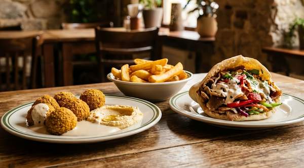 Carne, pollo, arroz, patatas, queso feta, falafel, ensalada y salsas