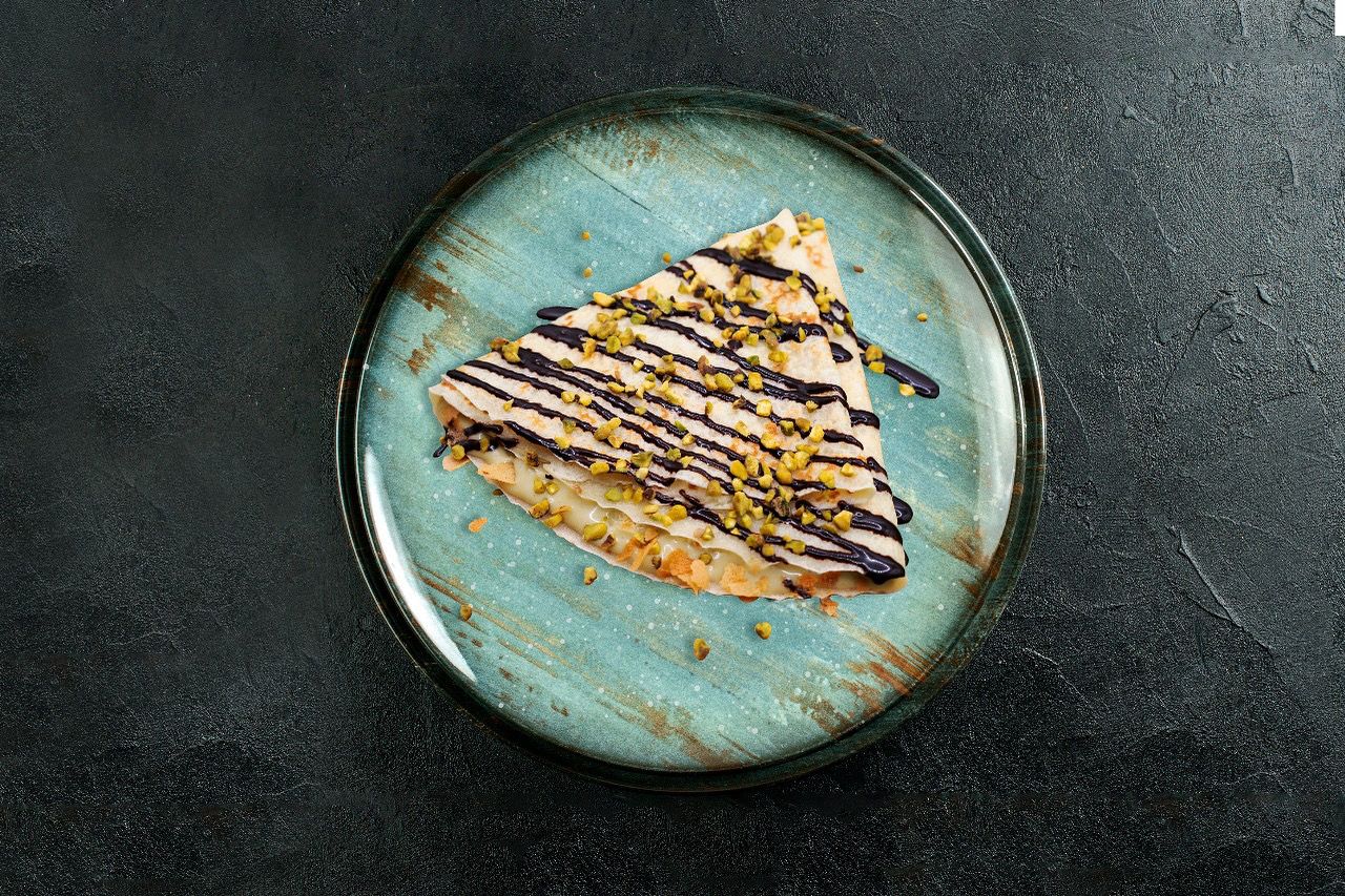 კრეპი ფსტის კრემით, ფსტის ნატეხები, შოკოლადის ტოპინგი