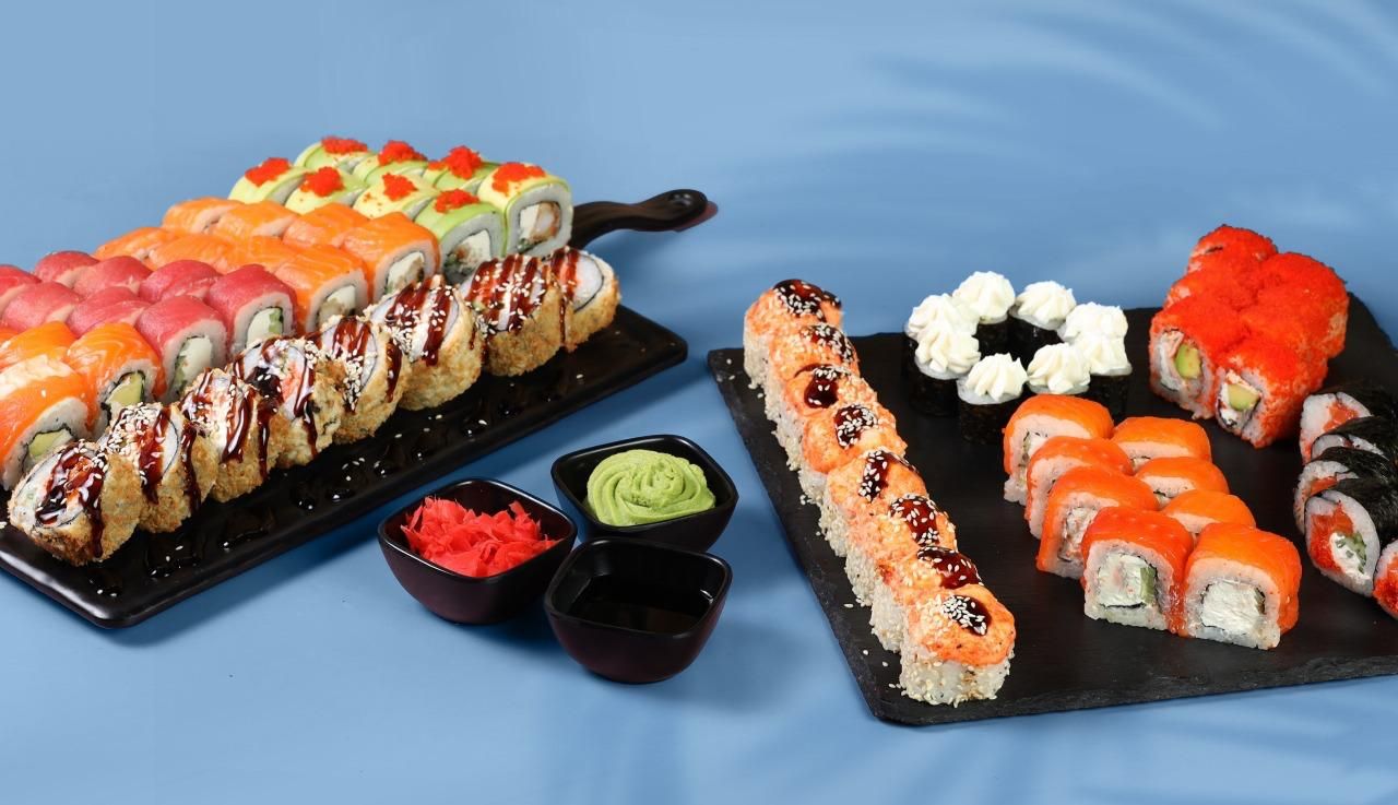 ფილადელფია, კალიფორნია ორაგულით, კალიფორნია კრაბით, საკურა, გამომცხვარი როლი ორაგულის. კრაბის გამომვხვარი როლი, ���ეტი 48 ნაჭერი