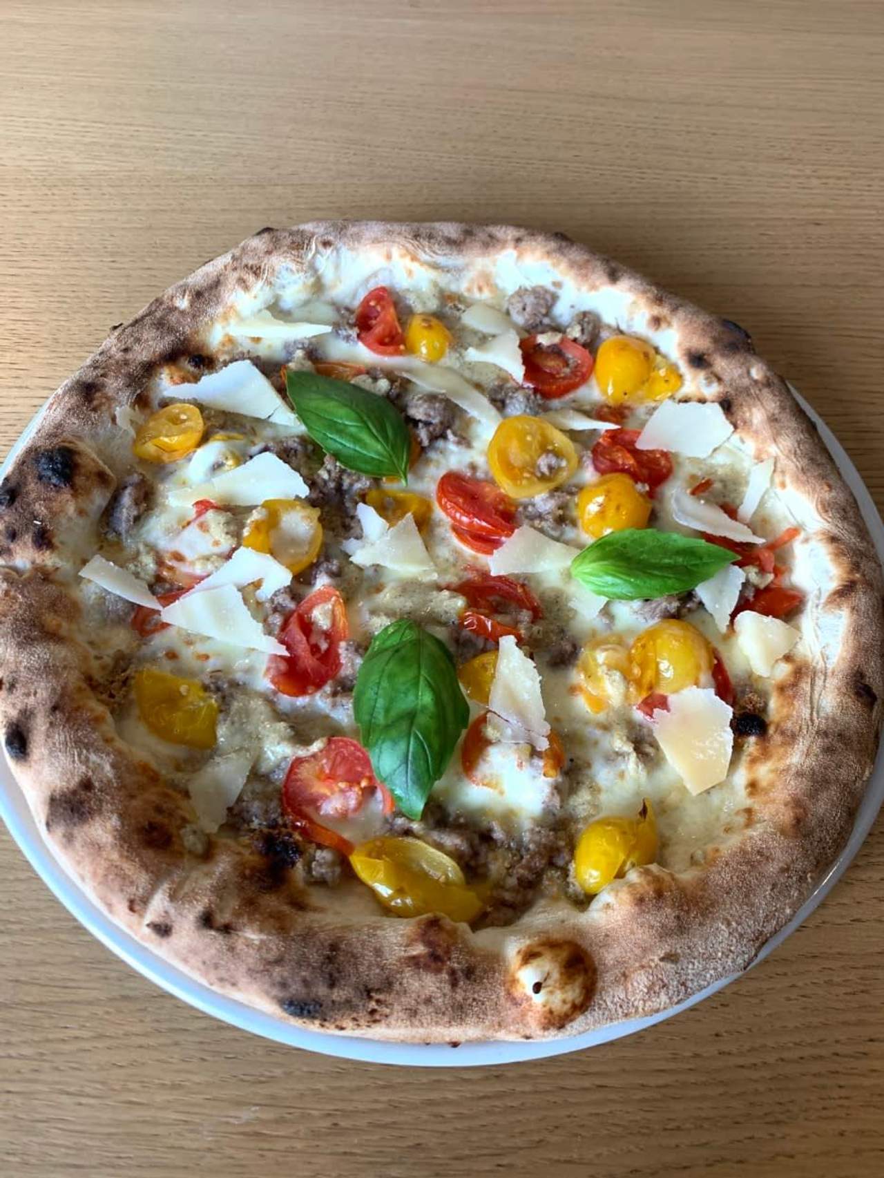 Mozzarella, crema di noci, pomodorini gialli pomodorini rossi, salsiccia fresca, provola di Agerola, scaglie di parmigiano DOP