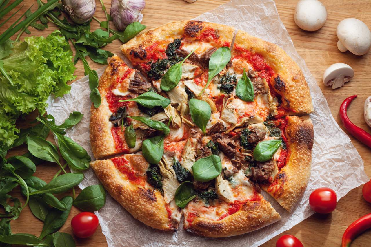 Pomodoro, mozzarella, prosciutto cotto, salsiccia, funghi e carciofi