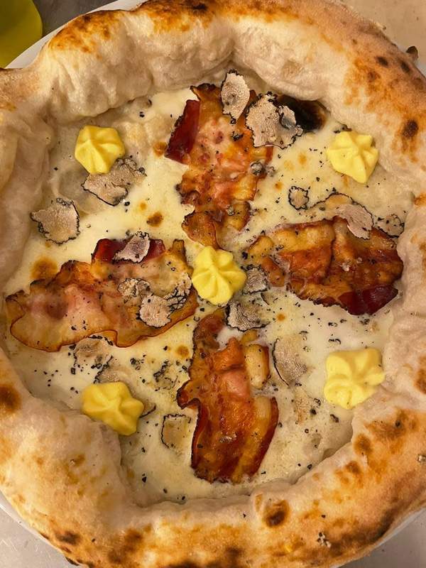 Crema di pecorino romano, bufala, guanciale croccante, crema d'uovo semi fredda e lamelle di tartufo uncinato.