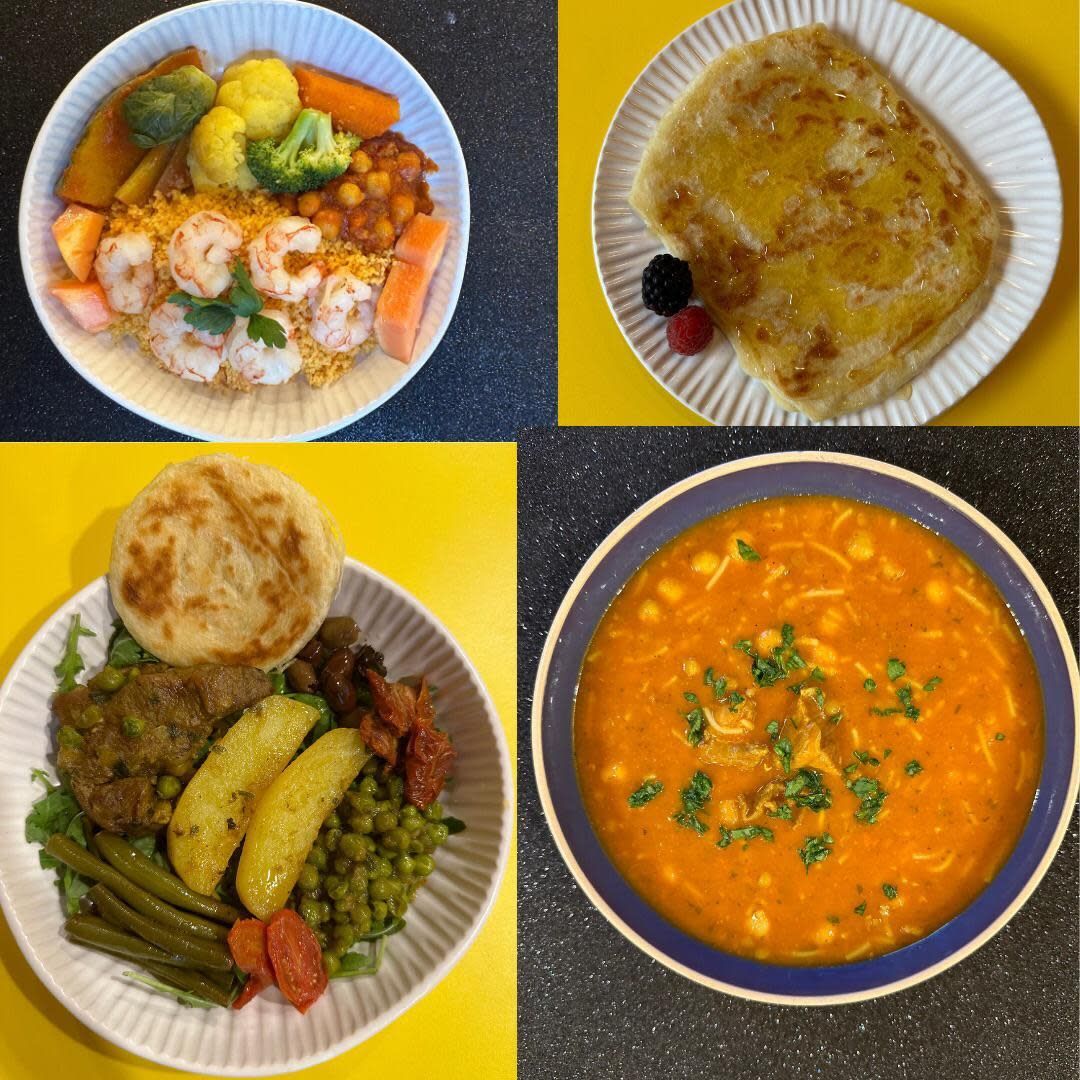 Gamberetti, couscous, zucca, papaya, ceci, carote e broccoli,carciofi, rapanelli,sedano