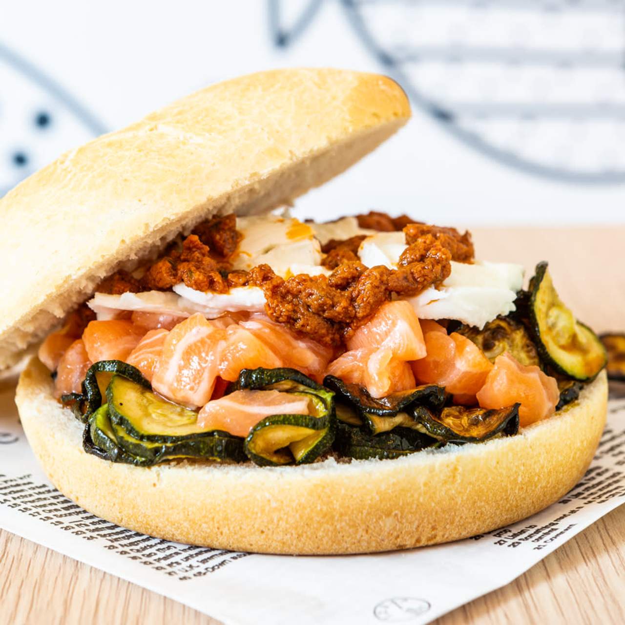 Tartare di salmone, crema di ricotta, zucchine, pomodori secchi