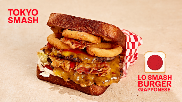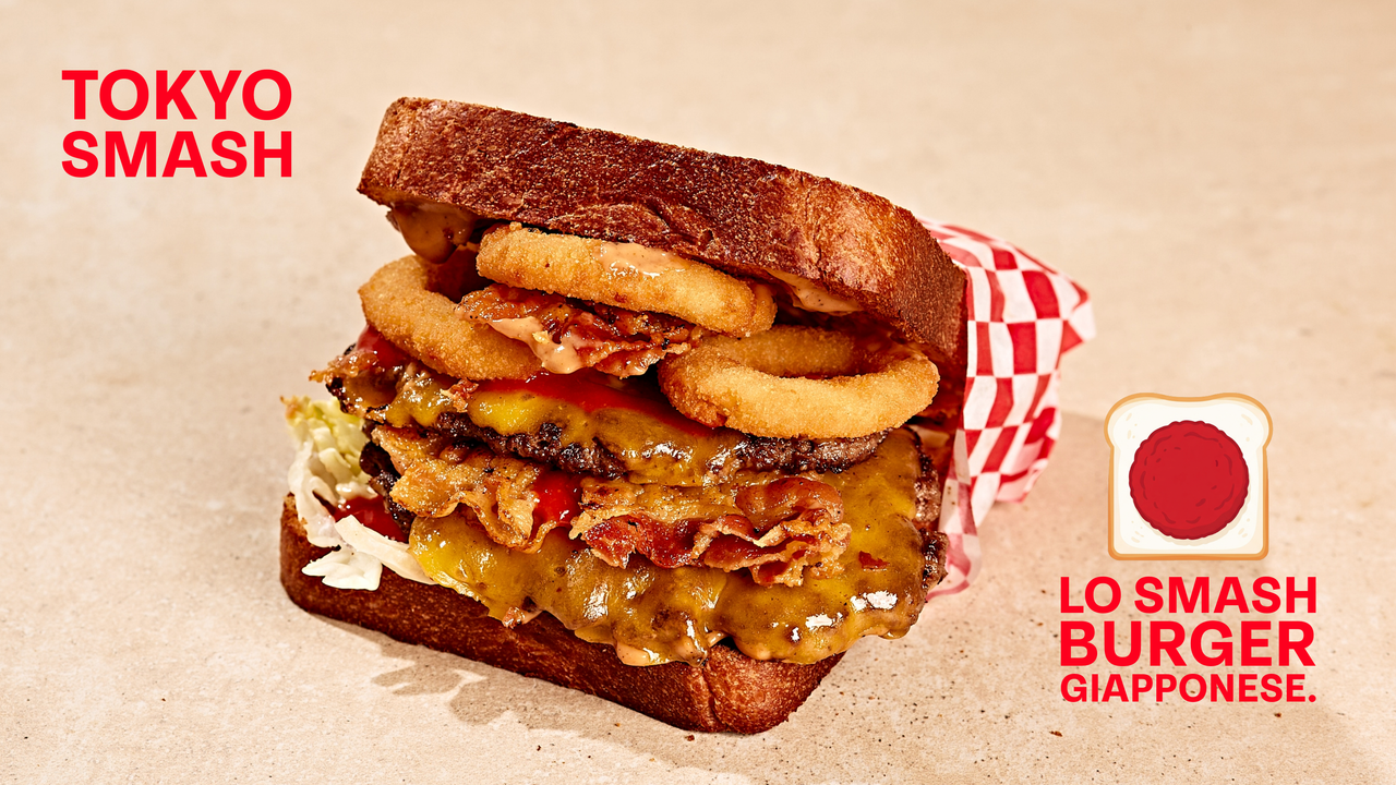 Shokupan artigianale, doppio smash burger di carne danese dry aged con doppio cheddar, cipolla alla griglia, maionese alla senape e salsa tonkatsu.