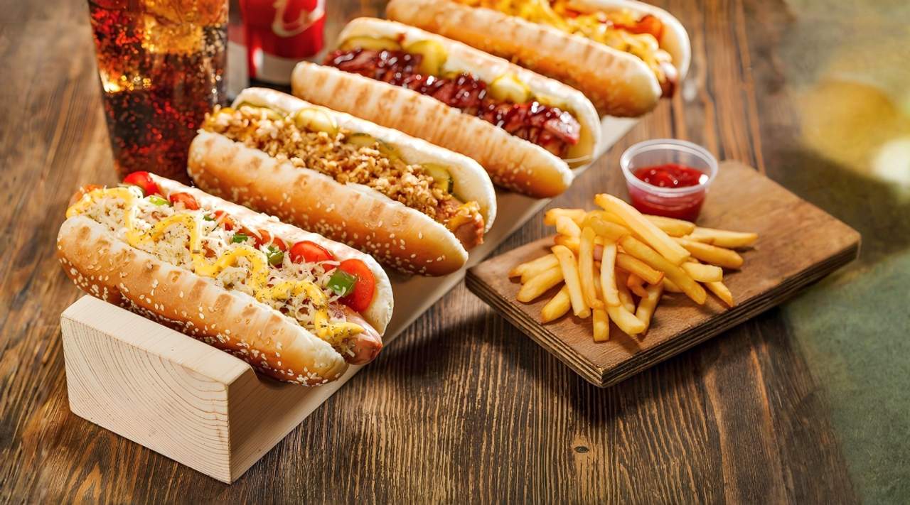 Карамелизированая булочка, обжареные во фритюре 2 куриные сосиски и картофель фри, три соуса - майонезный соус "провансаль", шашлычный кетчуп первой категории а так же сырный соус, свежие овощи- три ломтика огурчика, и 2 ломтика томата