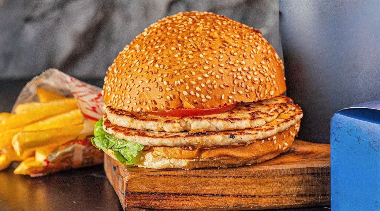 Бургер из пышной булочки с кунжутом с двумя сочным фирменными котлетами из куриного фарша, листьями салата и соусом "Тартар"