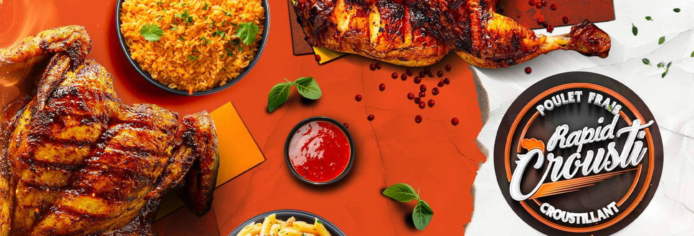 2 Poulet, 4 accompagnements au choix, 4 sauces au choix, boisson 1l