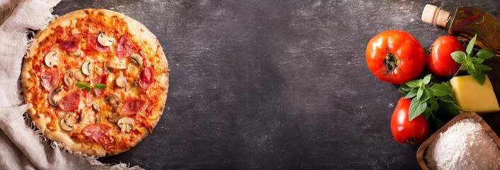 Sauce tomate, mozzarella, viande hachée, dinde fumée, pepperoni, champignon, oignon