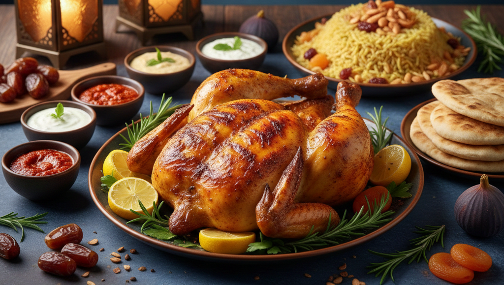 Harira, chebakia, datte, oeuf dûr, 2 briwa poulet, jus d'orange, plat demi poulet grillé (riz,frites,légumes sautés)