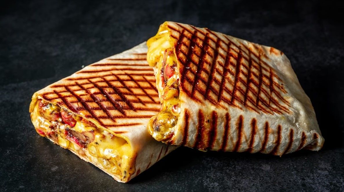 Pui la gratar, mozzarella rasă, sos blanche cașcaval, cartofi prajiți cu sos de cașcaval, sos algerian, tortila cu adaos de cascaval.