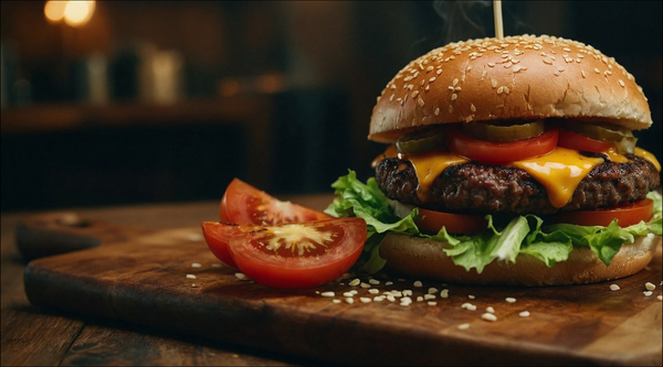 Dupli burger, lepinja, zelena salata, Chef sos, luk, paradajz, kiseli krastavci, cherry, sir, hrskava slaninica