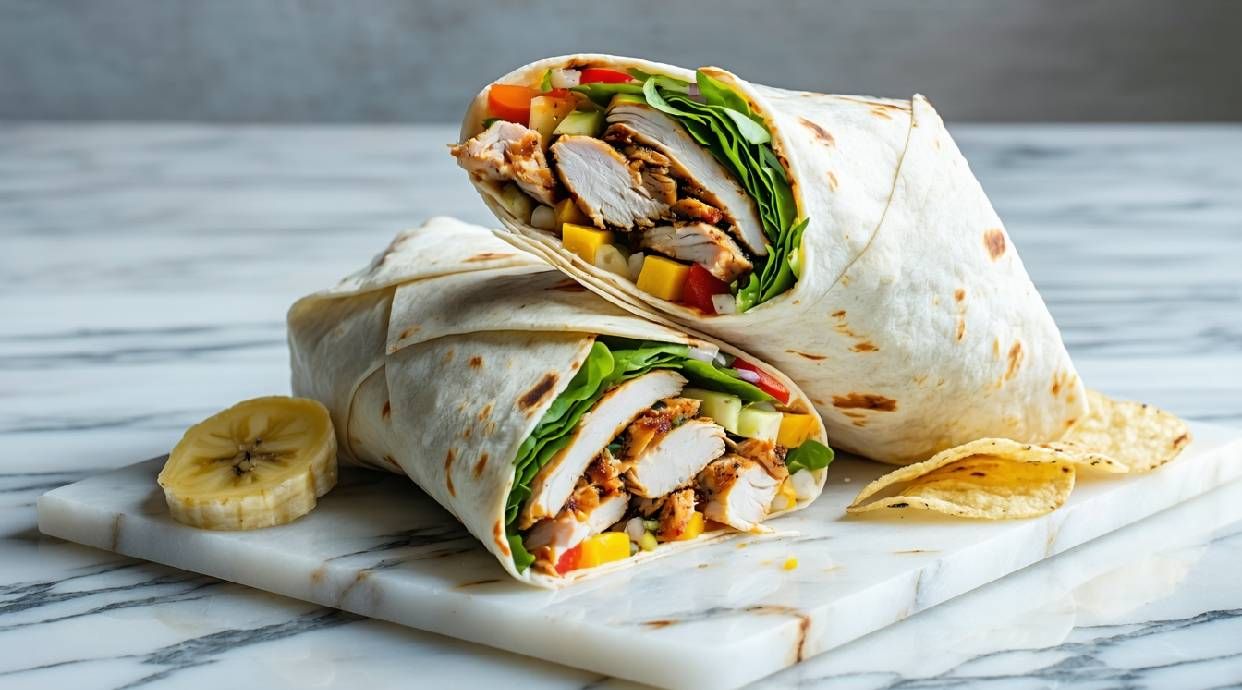 Grilled chicken shawarma wrapped with vegetables and sauce.