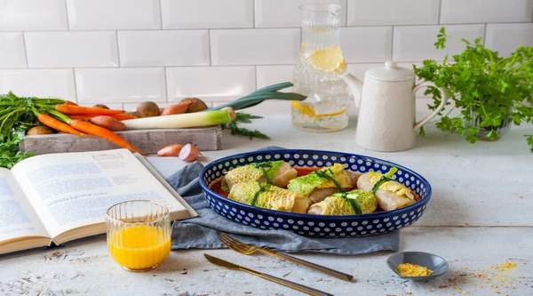 Mięso mielone, pieczarki, cebula, dynia, sos. Alergeny: mąka pszenna, mleko, jaja