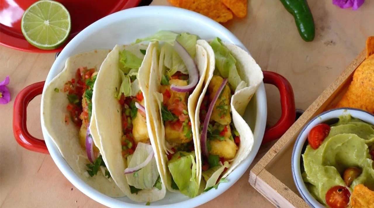 Kawałki mięsa drobiowego marynowane w mieszance przypraw z papryką i cebulą, podawane z tortillami pszennymi i sosami śmietanowym, czosnkowym i salsą pomidorową.