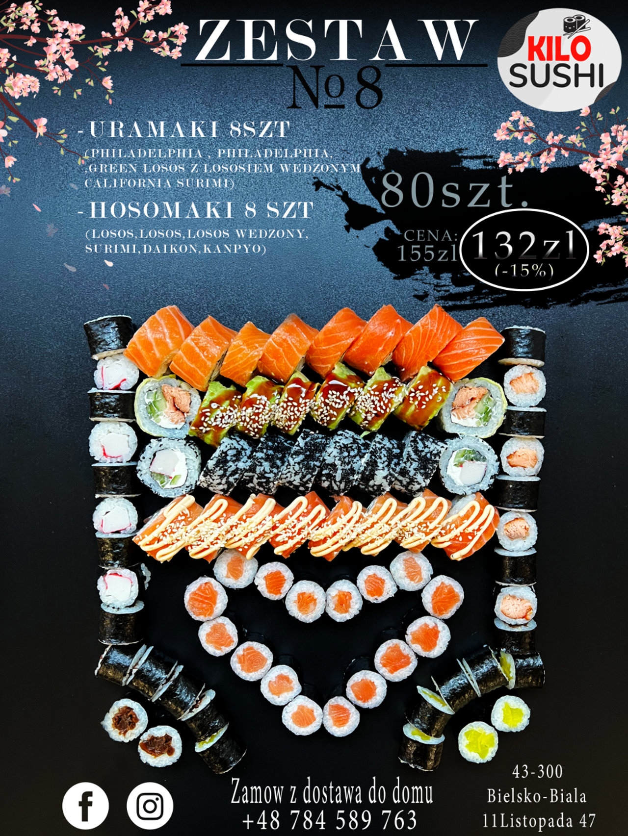 8x Philadelphia łosoś 8x Philadelphia łosoś z awokado 8x Green łosoś wędzony 8x California z surimi 8x hosomak łosoś 8x hosomak łosoś 8x hosomak łosoś wędzony 8x hosomak kanpyo 8x hosomak daikon 8x hosomak surimi