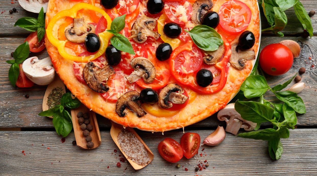 Pomidory pelati, mozzarella fior di latte, pieczarki, brokuły, cebula, pomidor, gorgonzola