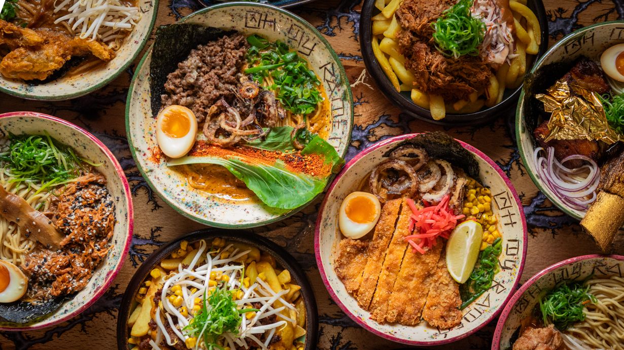 Kremowy bulion, tare na bazie pasty miso, boczniak w tempurze, palona kukurydza, kiełki fasoli mung, bambus, sezam, dymka, nori