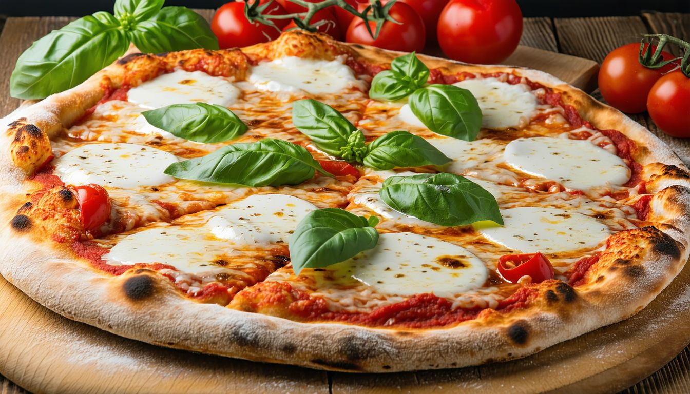 pelati, mozzarella fior di latte, gorgonzola, czosnek, suszone pomidory, szpinak baby, płatki grana padano
