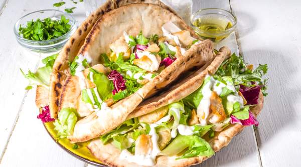 pita, mięso 180 g, surówki (kapusta biała, kapusta czerwona, marchewka), sos