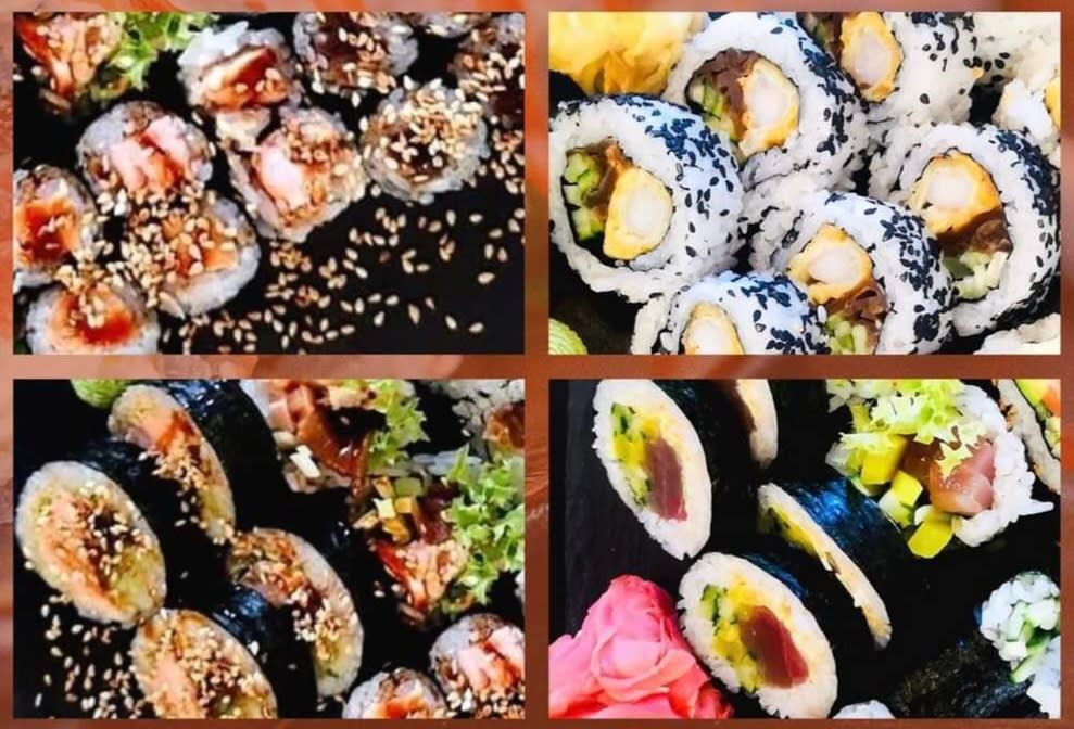 Futomaki z surowym tuńczykiem 6szt., Futomaki z węgorzem 6szt., California z krewetką w tempurze 8szt., California z surowym łososiem w środku i awokado, mango na zewnątrz 8szt