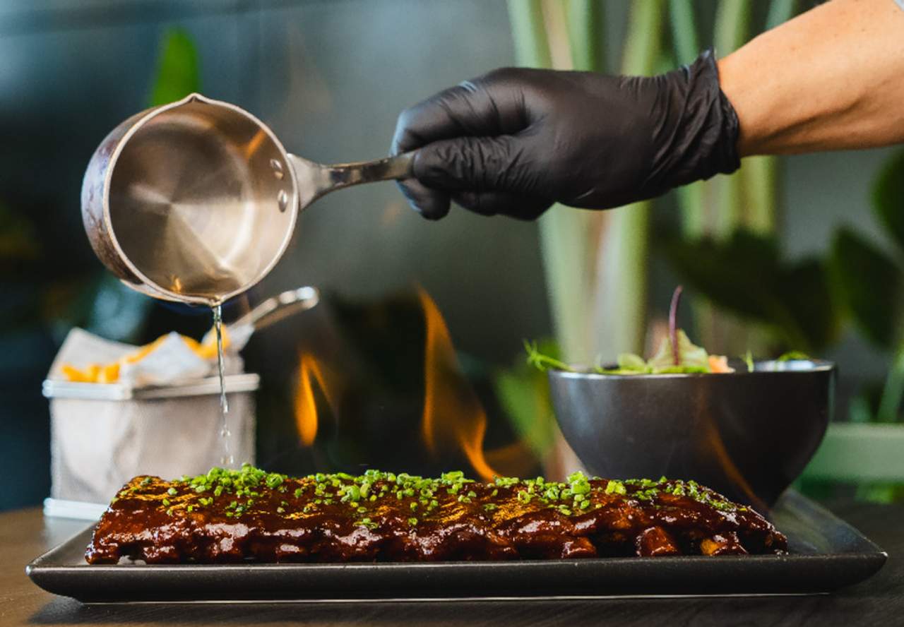 Długo duszone żebro wieprzowe, frytki, colesław z białej kapusty, sos bbq. Zawiera śladowe ilości alkoholu.