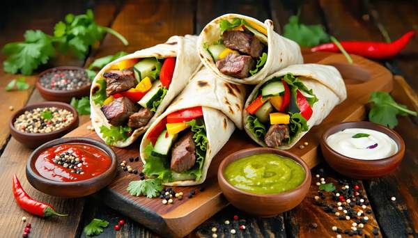 Mięso, sos, sałata lodowa, oliwa, ogórek, pomidor. Zdjęcie poglądowe