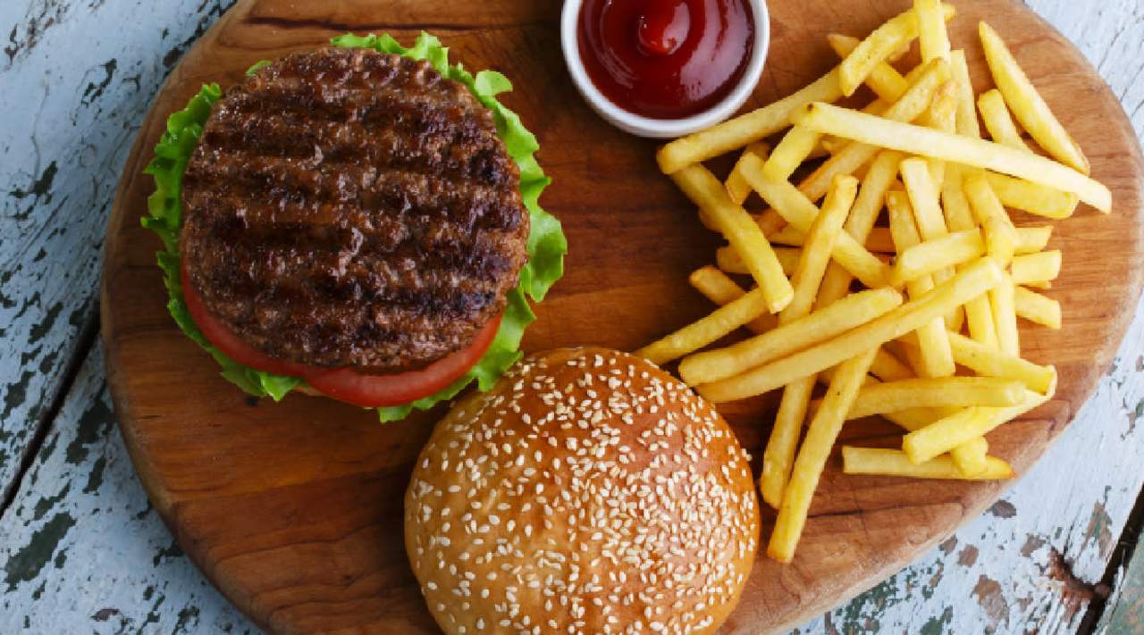 Pikantny filet z kurczaka zapiekany serem mozarella z warzywami i frytkami oraz sosem słodko-pikantnym