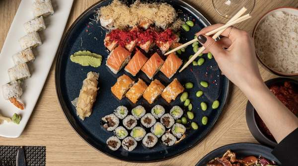 Tuńczyk, hamachi, łosoś, okoń morski, krewetki tygrysie, kolendra