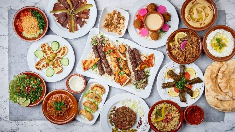 9 przystawek zimnych:Tabbouleh, Babaghanouj, Basterma, Loubieh bil Zeit, Shanklish, Mdardara, Labneh, Hommous,Warak Inab 3 przystawki ciepłe:Halloumi,Falafel,Krayedis 2 dania główne:Kofta Halabiyeh oraz Shish Taouk Dodatki:Ryż Basmati oraz chleb Pita