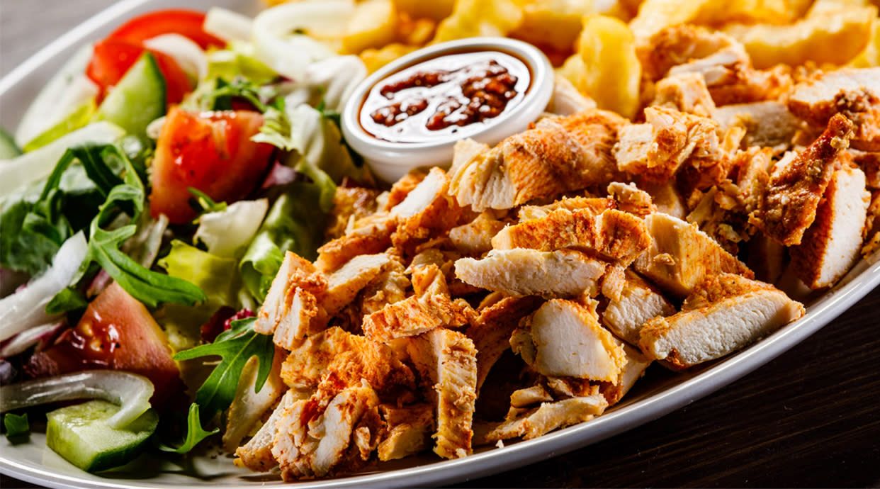 Mix mięs, frytki, kasza lub ryż, surówki, sos