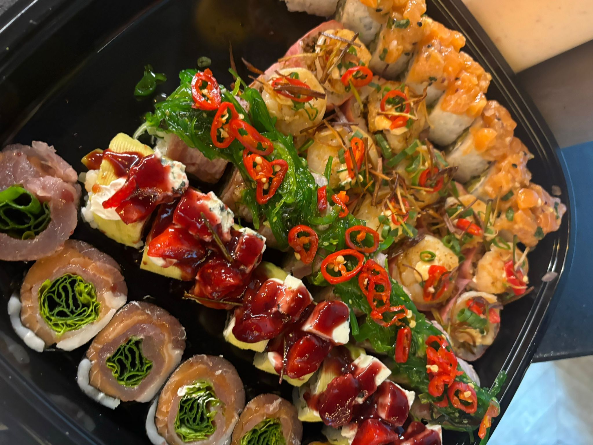 Futomaki z pieczonym łososiem: Łosoś pieczony,Kanpyo,Ogórek,Sos kobe California Tilapia - ryż ,tykwa w temperaturze,oszinko,ogórek, serek. Obłożona tilapią opaloną, kobe , por prażony. Sharingan - węgorz w tempurze, ogurek,oszinko,serek. Obłożona awokado i papryczkami. Hoskmak -oszinko