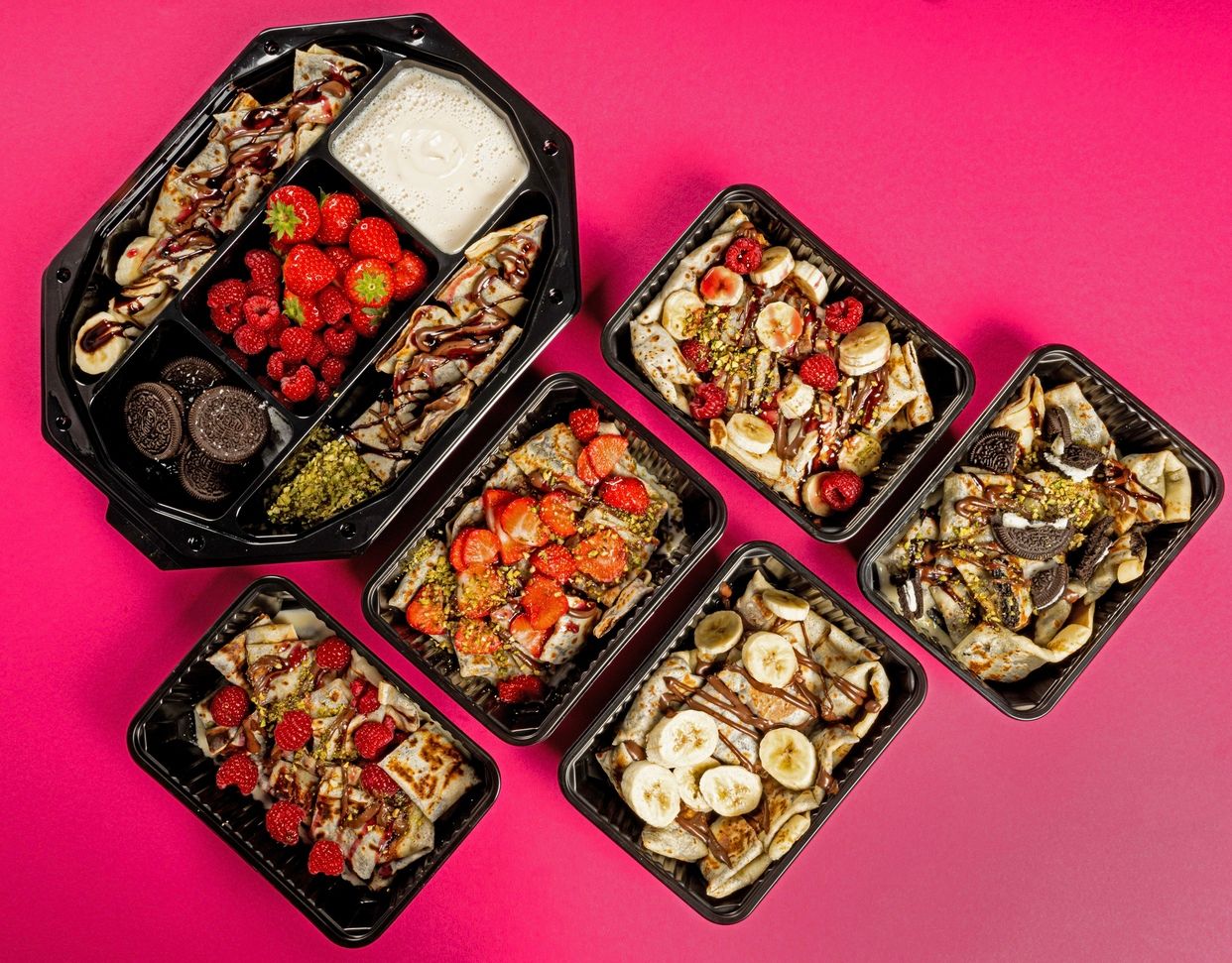 - Clătită (crepieră) 40 cm, tăiată pătrățele. - Nutella. - Cremă Fistic. - Topping Ciocolată Albă. - Cataif prăjit (crocant). - Căpșuni proaspete. - Fistic granulat. (360g) Doar pentru iubitori de cataif crocant si crema de fistic.