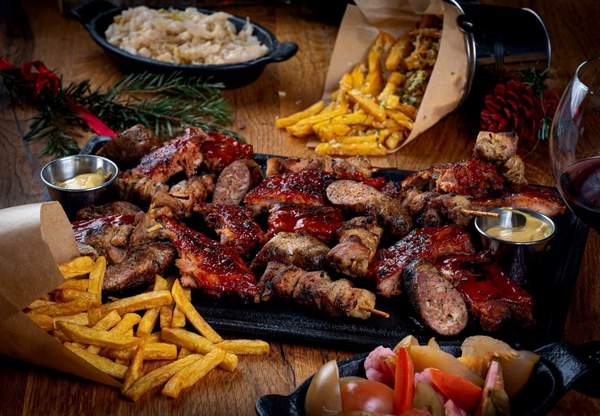 4 ceafa de porc, 4 frigarui mix, 4 carnati, 4 mici, 4 aripioare, cartofi prajiti, mustar, muraturi, sos Matei - 3.4kg