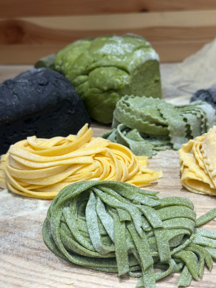 Tagliatelle proaspete (oua, semola, faina 00, pudra de spanac, apa, ulei de masline Castrum, sare)-120g/200g produs finit. VE100g: 371kcal, grăsimi 4,5g, acizi grași saturați 0,6g, glucide 69,4g din care zaharuri 1,7g, proteine 14,5g, sare 0,6g.