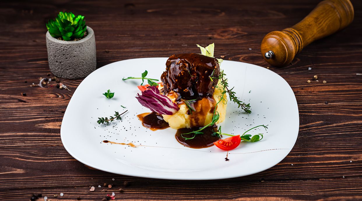 Obrăjori de vită, cartofi, vin roșu, muștar, lapte, unt, ciocolată, tarhon - 350g