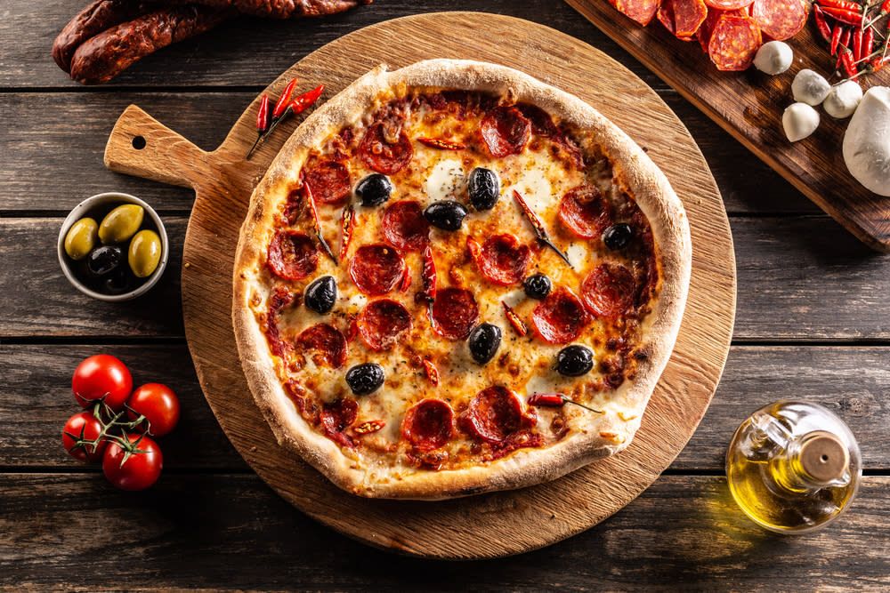 Sos de rosii, mozzarella, salam picant. Calorii 1209, proteine 57, lipide 49, glucide 124 - 500g