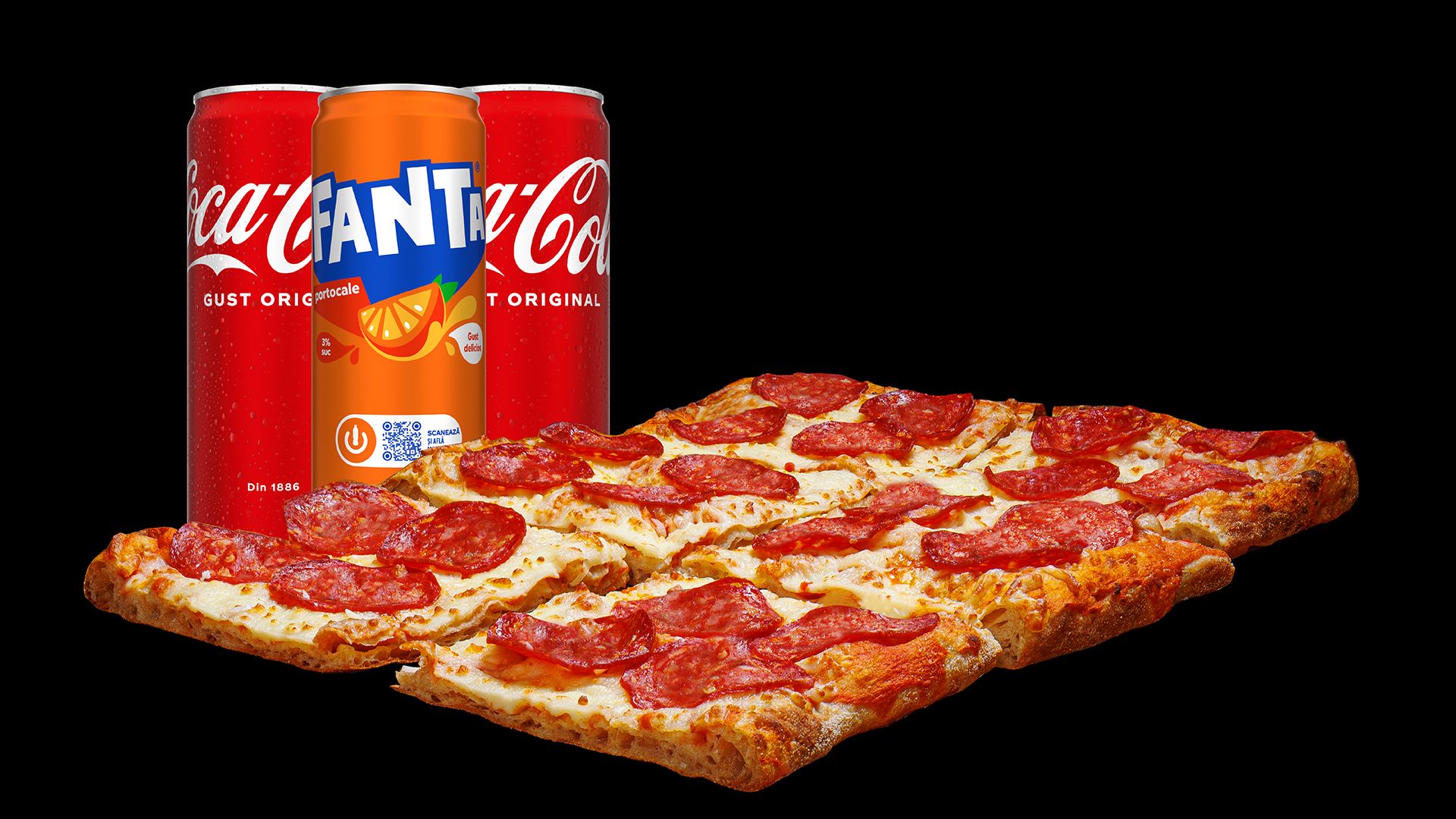 Pizza cu salam picant - Felie 120 g.: Gramaj 120gIngrediente: Baza de pizza cu rosii (faina alba de GRAU, apa, sos de rosii 24,5% (rosii 24,4%, sare), faina integrala de GRAU, ulei de masline extravirgin, gris de GRAU dur, maia (contine GRAU), sare, drojdie de panificatie), BRANZA mozzarella rasa (cas (LAPTE de vaca pasteurizat, cheag, fermenti LACTICI, sare), sare), 13 % salam picant (96% carne de porc (origine UE), sare, aroma de porc, aroma de fum, zaharuri: dextroza, conservant: nitrit de sodiu, nitrat de potasiu, extract de paprika, cultura starter). Poate contine urme de: OU, MUSTAR, SOIA.Declaratie nutritionala (100gr):Val energetica: 1115kj Val energetica: 266kcal Grasimi: 11g din care acizi grasi saturati: 4,7g Glucide: 30g din care zaharuri: 1,1g Proteine: 12g Sare: 2,04g Termen de valabilitate: 24 h Imagine cu titlu de prezentare