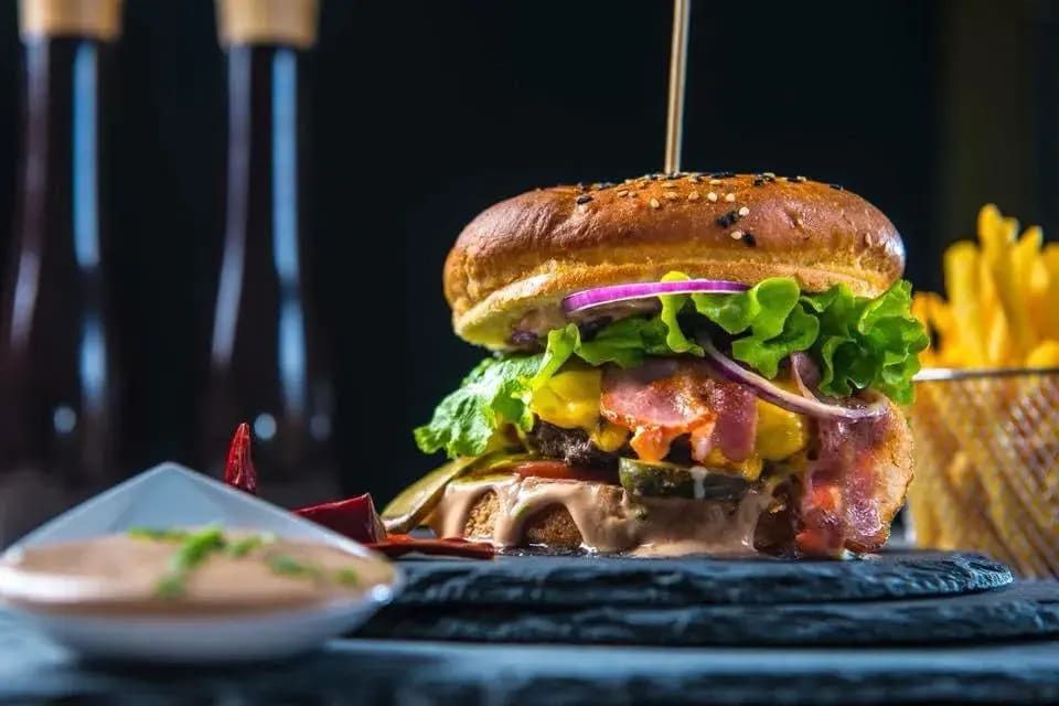 Carne de vita, salata verde, rosie, bacon, ceddar, castraveti murati, ceapa rosie, cartofi wedges, sos burger - 450g