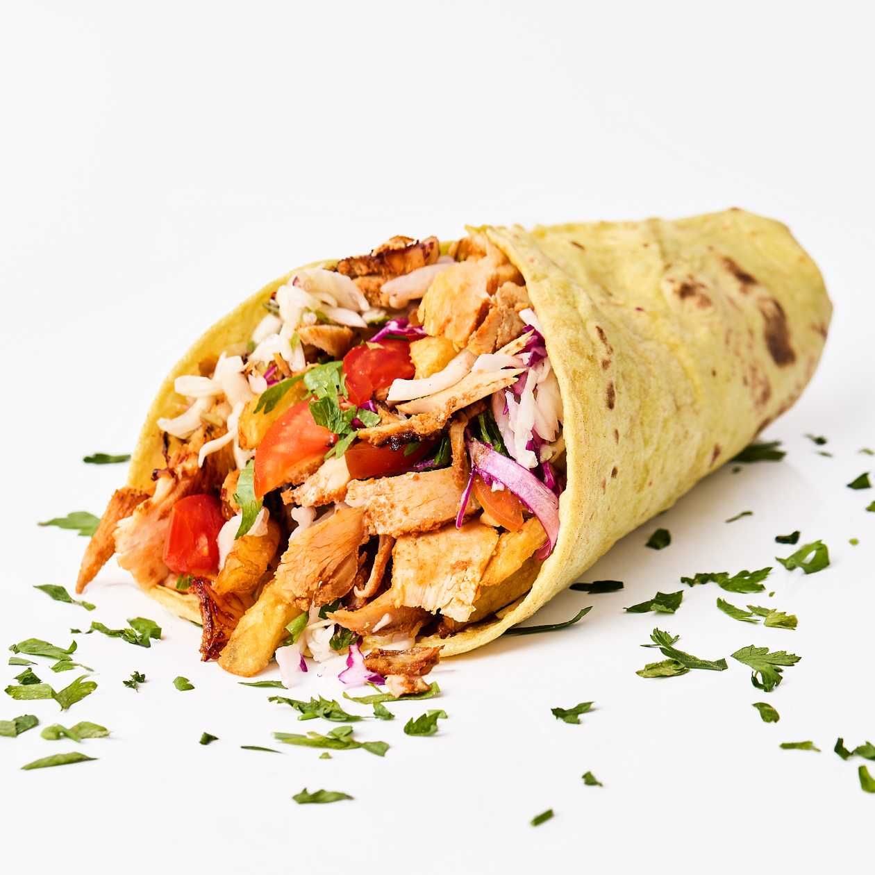 Carne de pui, cartofi pai, salate, sosuri, lipie - 500g