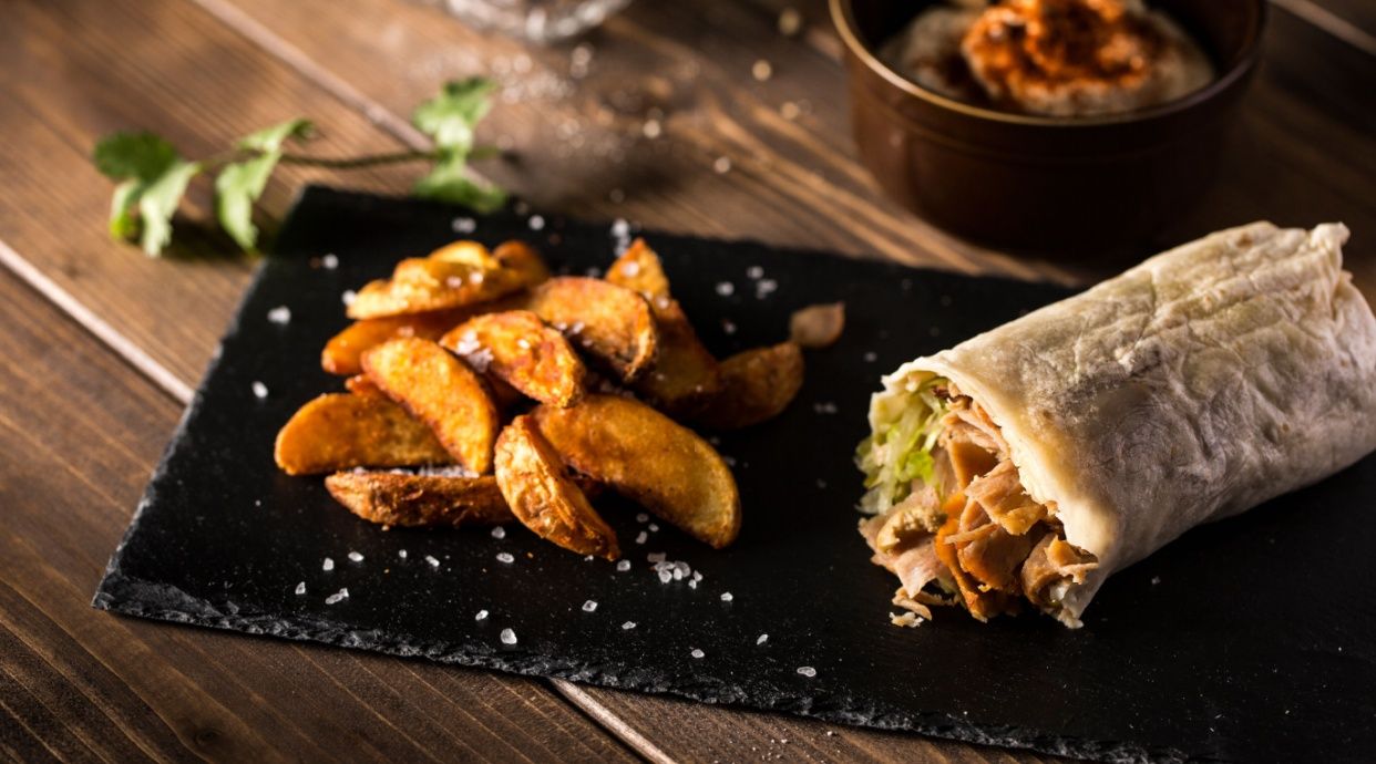 Lipie făcută pe loc, carne de pui, la alegere: salată iceberg, varză, castraveți murați, roșii, ceapă, 3 sosuri + cartofi prăjiți proaspeți - 580g