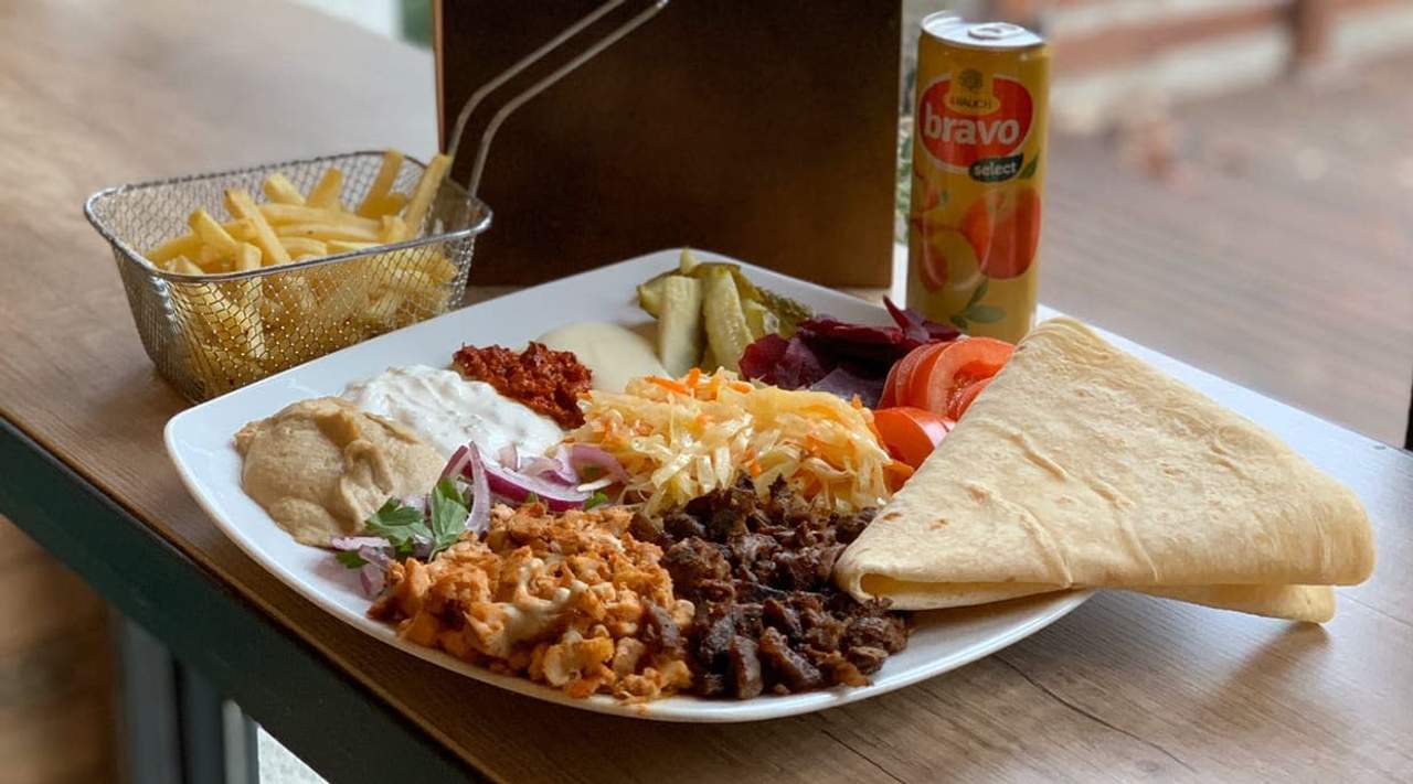 3 kom. kubbe ( burbul kuglica punjena sa mlevenim telecim mesom i orasima), pomfrit, sok, tortilja, salate po izboru, sos po izboru