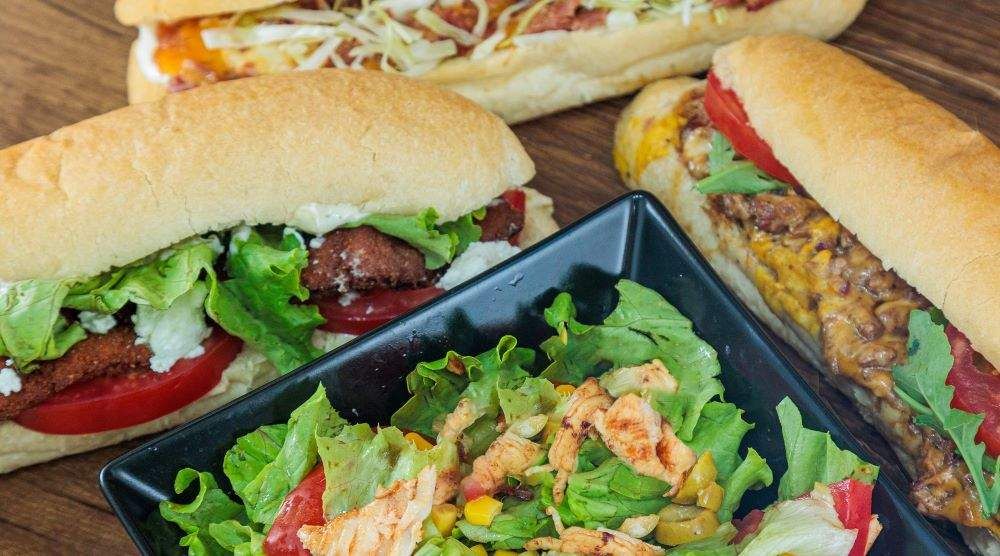 Tikvice, šampinjoni, kukuruz, praziluk, rukola, masline, pavlaka sa susamom, sos beli luk, paradajz, zelena salata, sveža hrskava kifla