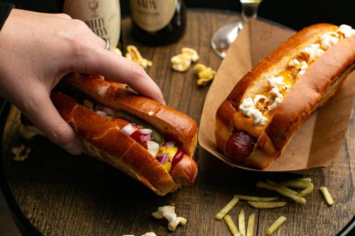 З двома молочними сосисками, корнішонами, томатами, червоною цибулею, соусами у вершковому бріоші