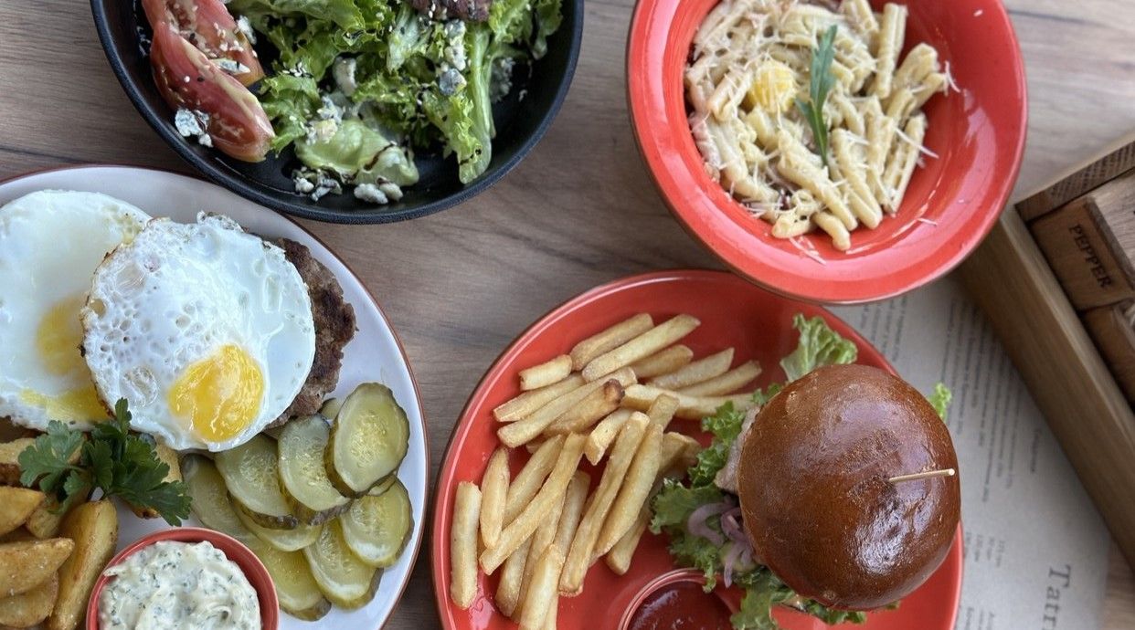 Рвана свинина в булочці бріош з гострим томатним соусом, тар-таром, маринованою цибулею, міксом салату, яйцем та солоними огірками. Під час відключення світла подаємо без картоплі фрі360гАлергени: яйце, глютен, часник