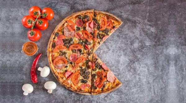 Шинка в/к, салямі в/к, печериці свіжі, перець болгарський свіжий, маслини, сир Моцарела, соус Шрірача, соус Томадоро, орегано сухий