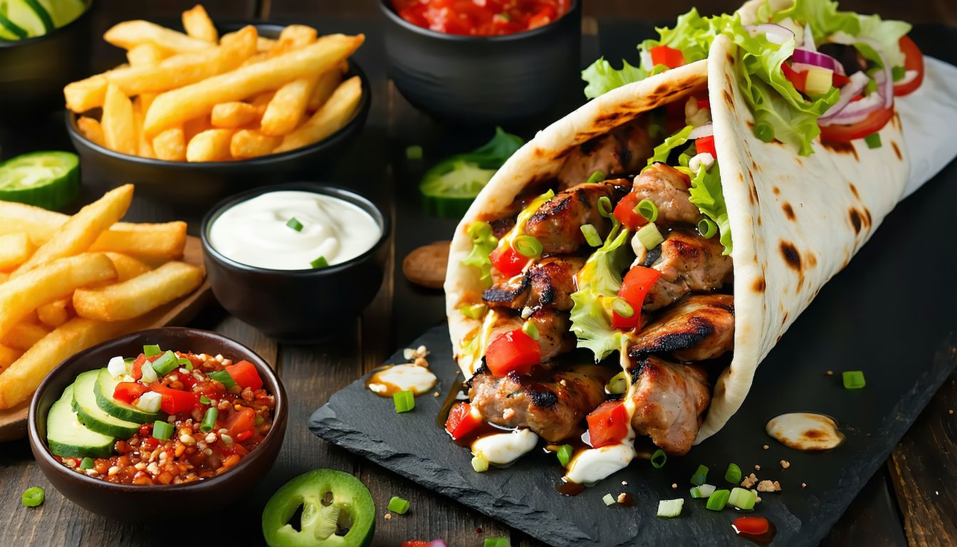 Лаваш, соус авторський, соус Часниковий, соус гострий, соус Томатний, гострий перець свіжий, капуста, цибуля, огірок маринований, морква по-корейськи, м'ясо куряче.