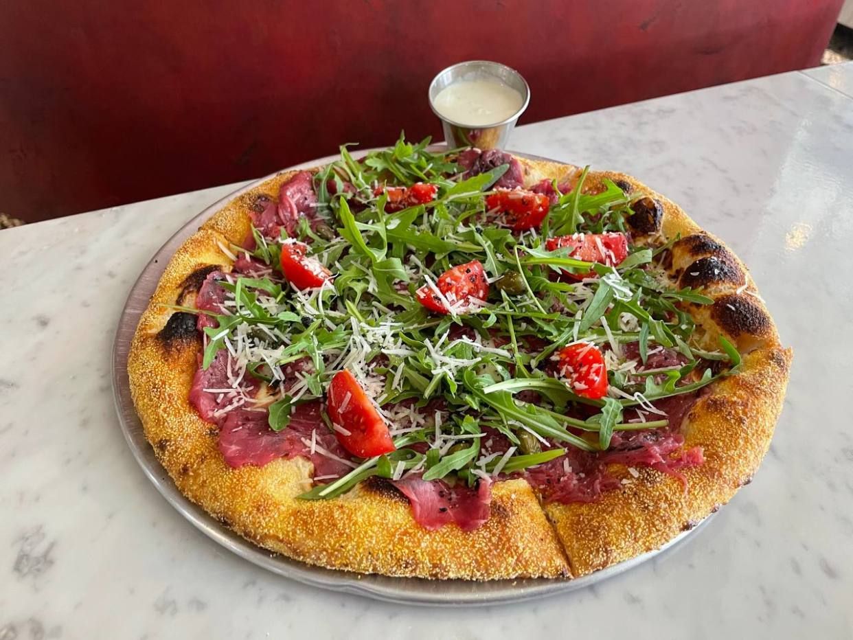 Фірмове тісто для піци з вершковою основою, додаванням мисливських ковбасок, перепелиних яєць та сиру моцарелла. Подається з салатом з чері, руколи та пармезану а також соусом для бортиків