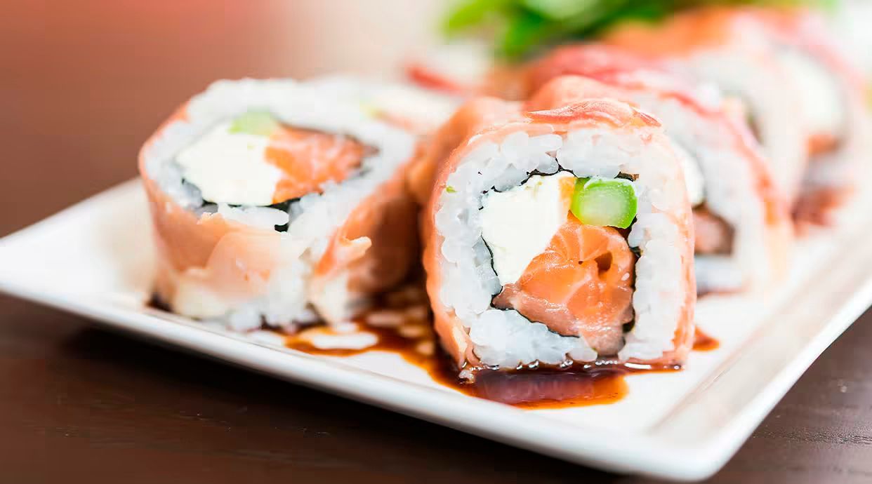 Рол з слабосоленим лососем, ніжним крем-сиром, авокадо, загорнутий у рис і норі