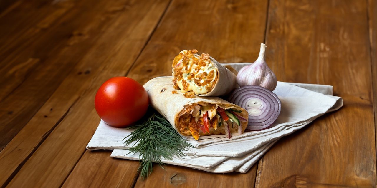Хрусткий лаваш, соковите м'ясо курки, свіжі овочі (капуста, помідор, огірок, зелень, цибуля "Марс") з додаванням наших фірмових соусів: "Тар-тар з соленим огірком", "Томатний зі шматочками помідорів" та хрустких цибулевих чипсів.
